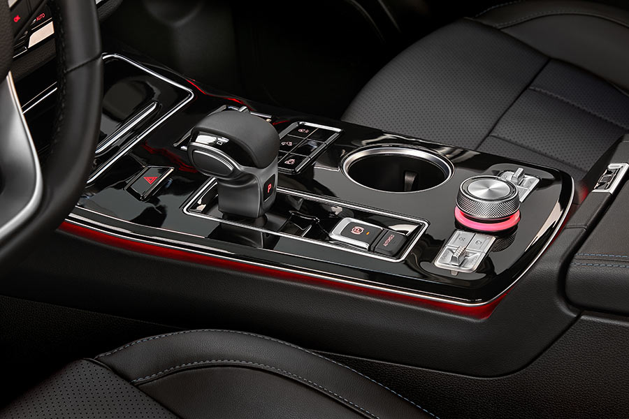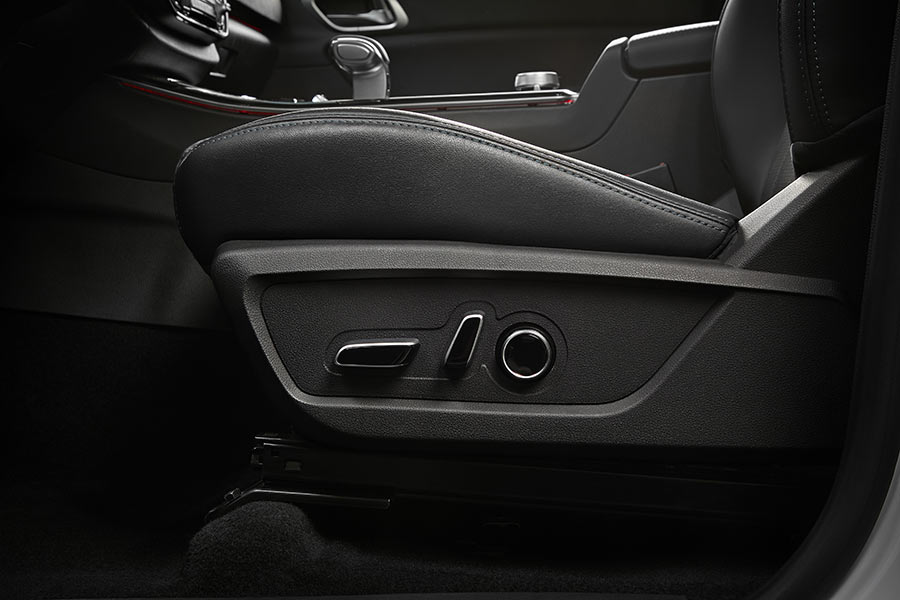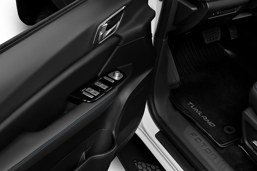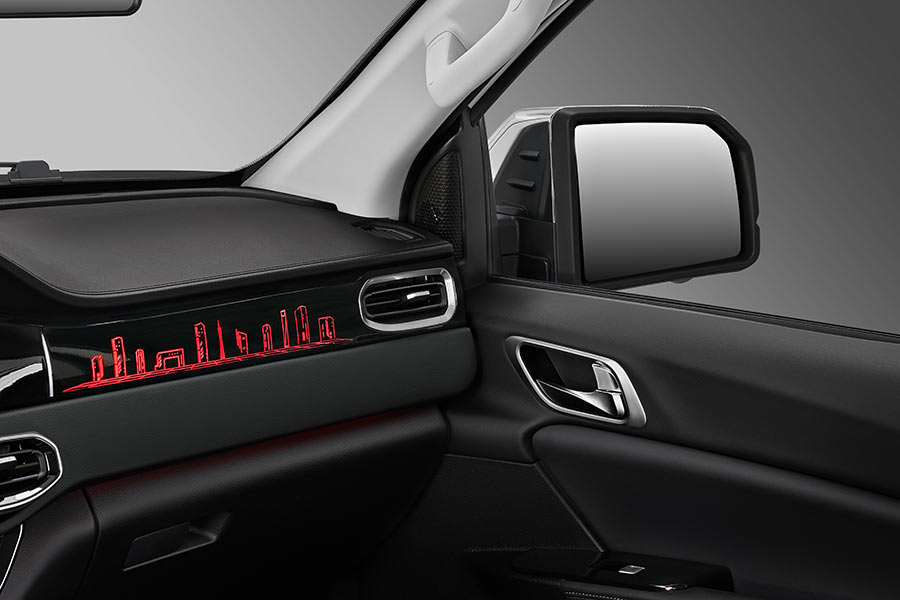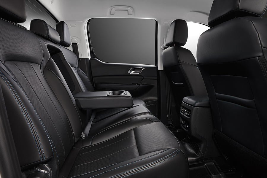 Оснащение — сильная сторона модели. В салоне предусмотрены беспроводная зарядка, четыре USB-порта, атмосферная подсветка с семью цветами, камера кругового обзора 360°. Передние сиденья получили вентиляцию, подогрев, перфорацию и поясничную поддержку, водительское кресло регулируется в 12 направлениях. На втором ряду — подлокотник, регулируемые подголовники, откидная подушка с боксом для хранения, отдельный блок климат-контроля и розетка 220 В. Для рамного пикапа — уровень оснащения более чем серьезный.