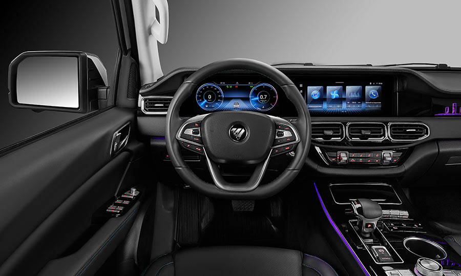Оснащение — сильная сторона модели. В салоне предусмотрены беспроводная зарядка, четыре USB-порта, атмосферная подсветка с семью цветами, камера кругового обзора 360°. Передние сиденья получили вентиляцию, подогрев, перфорацию и поясничную поддержку, водительское кресло регулируется в 12 направлениях. На втором ряду — подлокотник, регулируемые подголовники, откидная подушка с боксом для хранения, отдельный блок климат-контроля и розетка 220 В. Для рамного пикапа — уровень оснащения более чем серьезный.